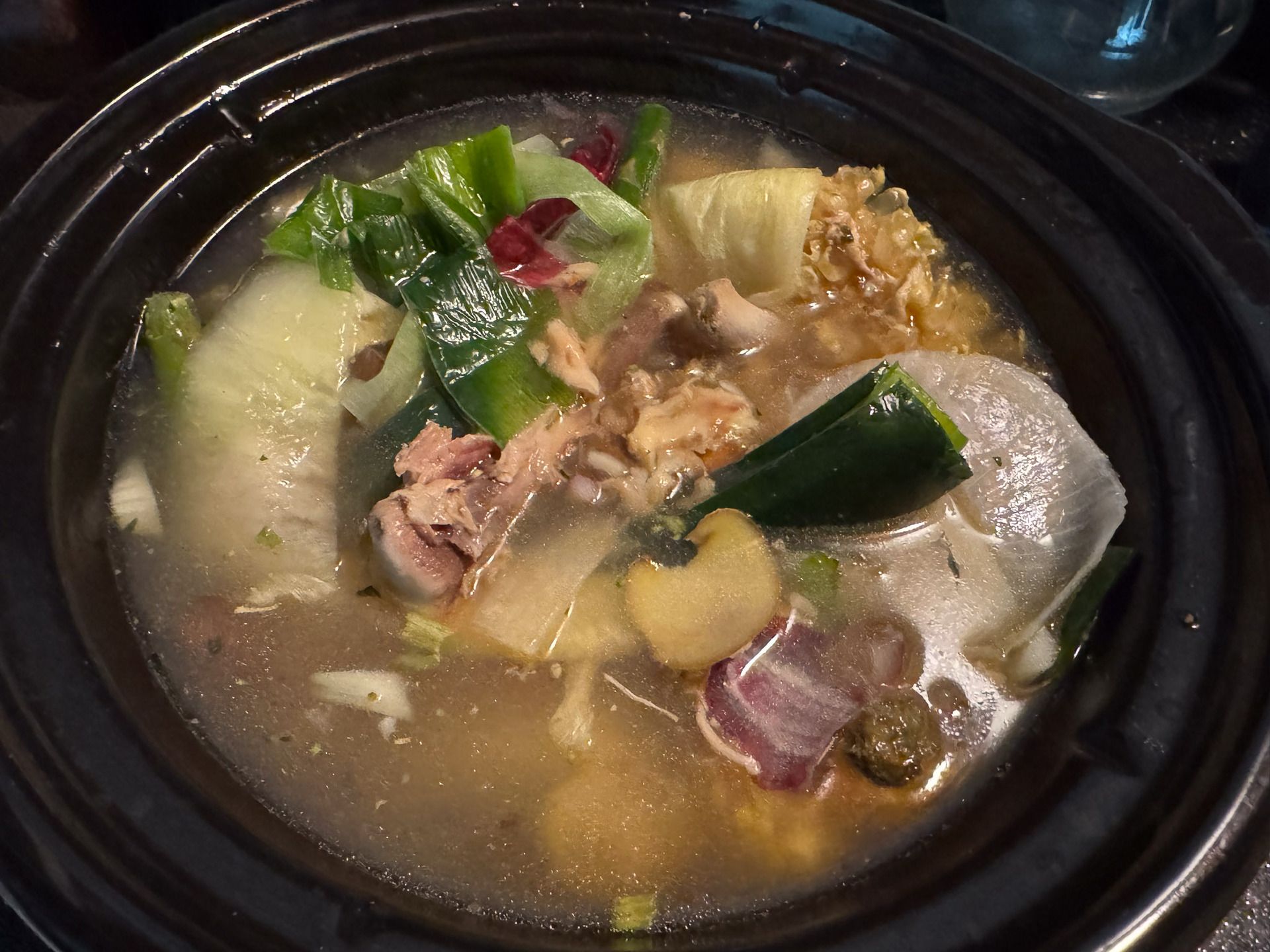 Good ol’ chicken noodle soup! One whole rotisserie chicken, leeks, carrots, potatoes, onion, lentils, and orzo pasta.