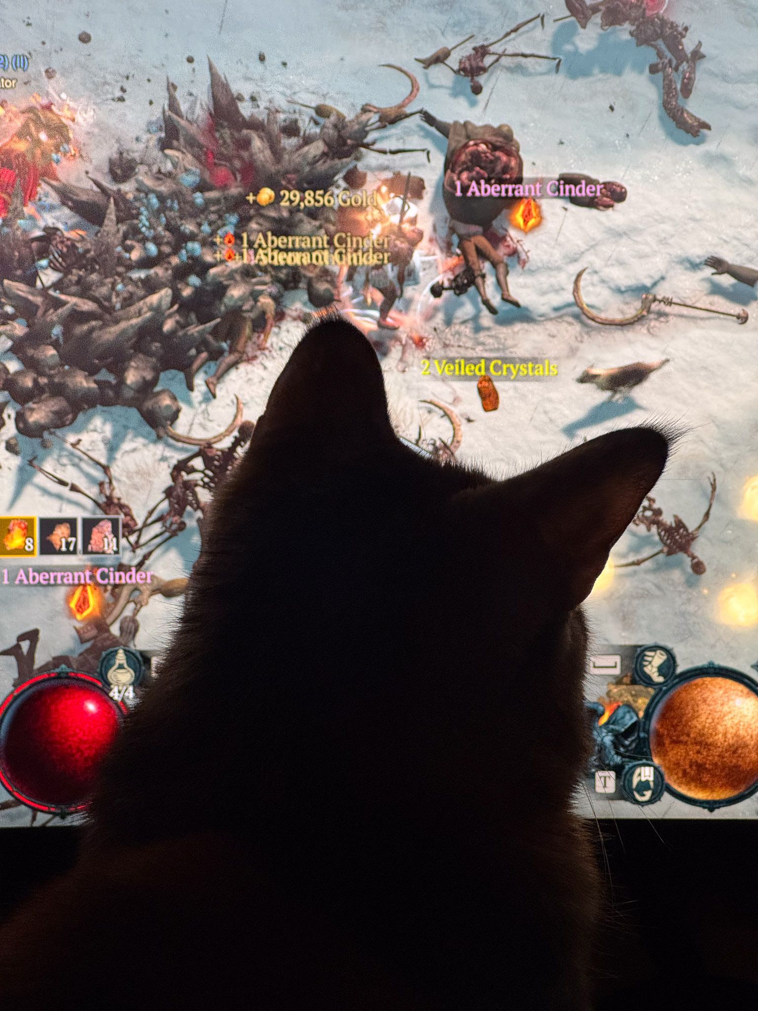 Penelope loves sitting directly in front of the monitor when I play Diablo IV. No other game; just this one. I’m sure there’s nothing important going on there on the screen.